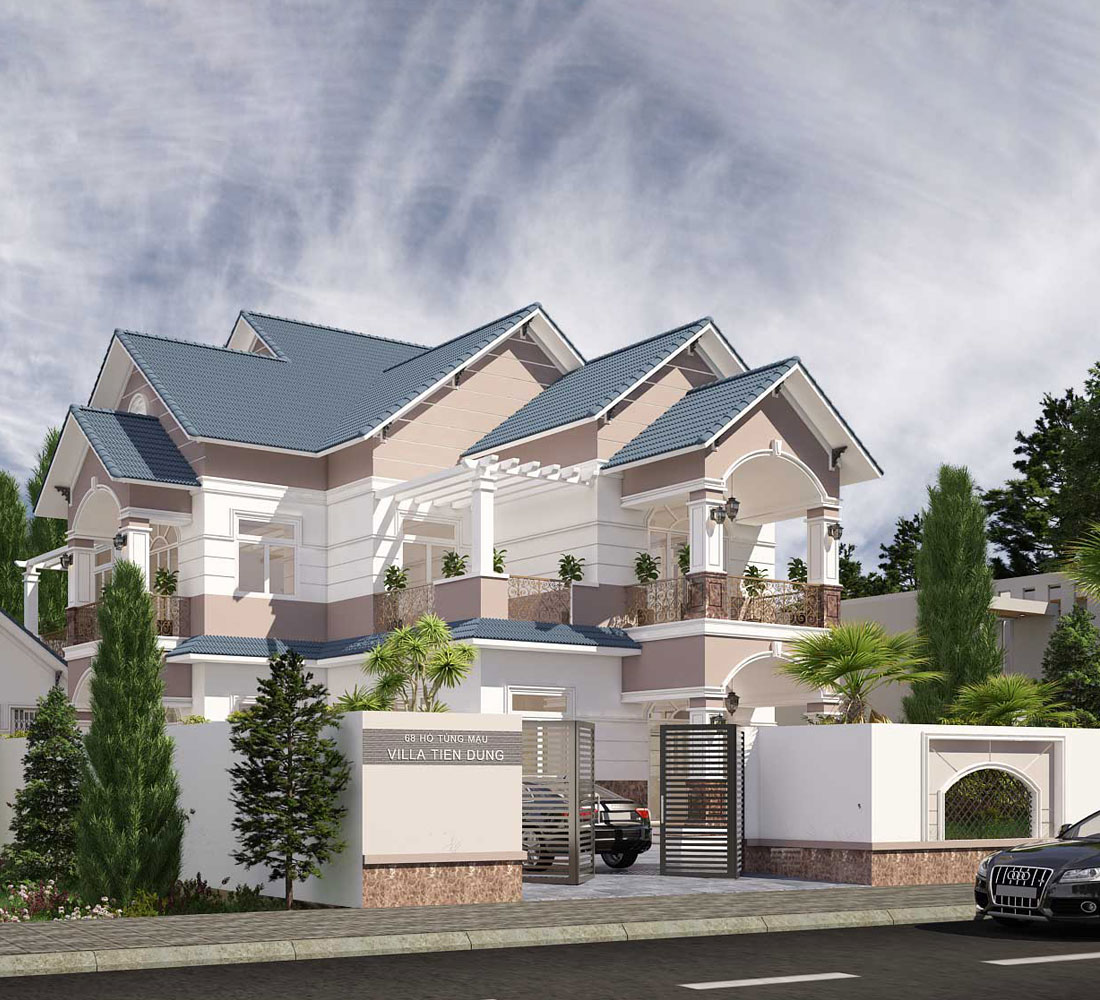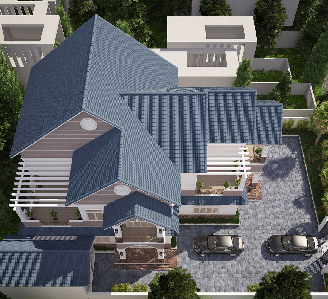 Mẫu thiết kế nhà villa 2 tầng mái Thái được xây dựng trên diện tích 350m2 kể cả phần sân. Thiết kế theo kiến trúc tân cổ điển châu Âu với mái Thái chữ A bằng ngói màu xanh vô cùng thanh thoát và đẹp mắt. Được kiến trúc sư bố trí theo đúng các nguyên tắc phong thủy nhằm mang đến mọi điều may mắn cho gia chủ về sức khỏe, tài lộc và trong công việc.