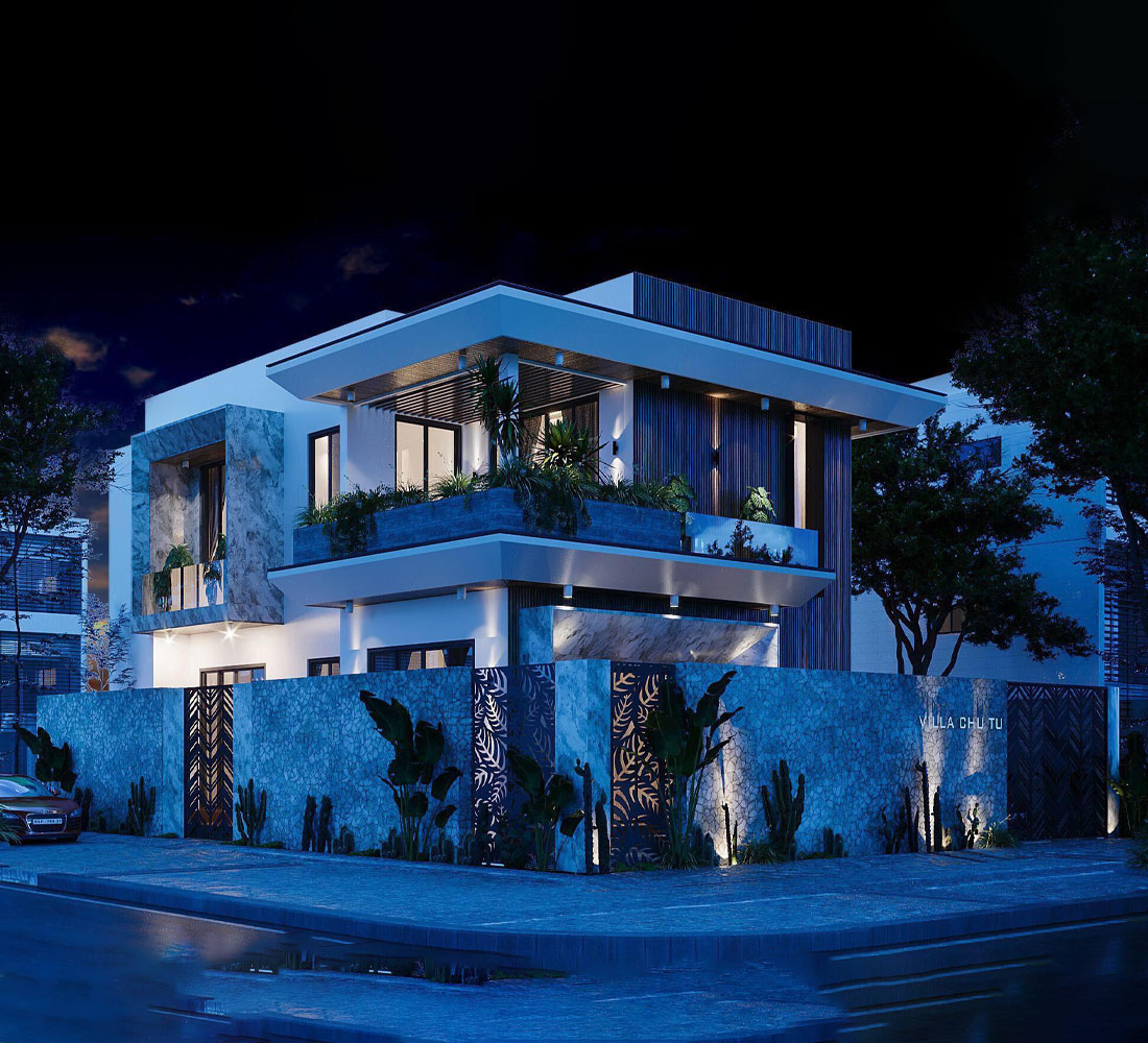 Sử dụng cây xanh cùng tiểu cảnh để kiến tạo không gian sân vườn. Tạo cảnh quan thẩm mĩ cho ngôi nhà. Sử dụng kính, ban công thoáng rộng, thiết kế full mặt tiền để tạo nên sự nổi bật so với các công trình khác cùng loại hình kiến trúc.