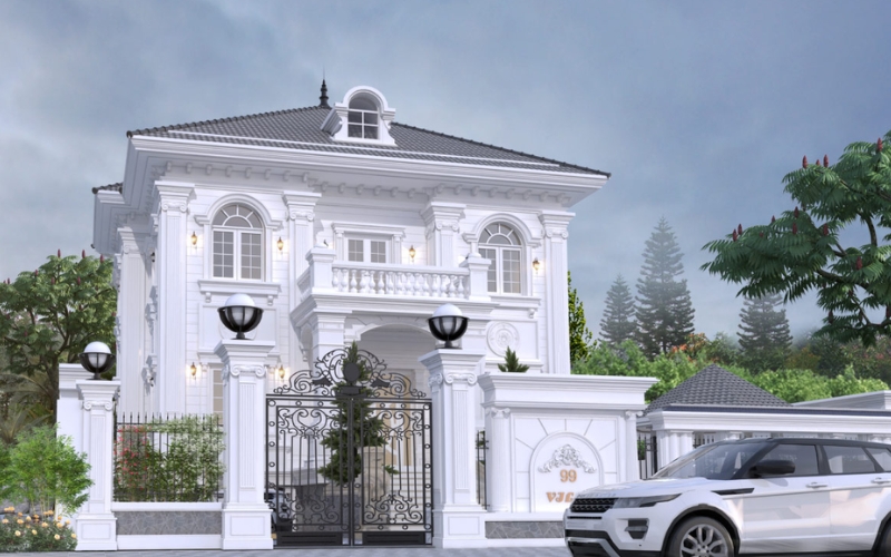 Mẫu biệt thự tân cổ điển 2 tầng 1 tum với gam màu trắng thanh thoát