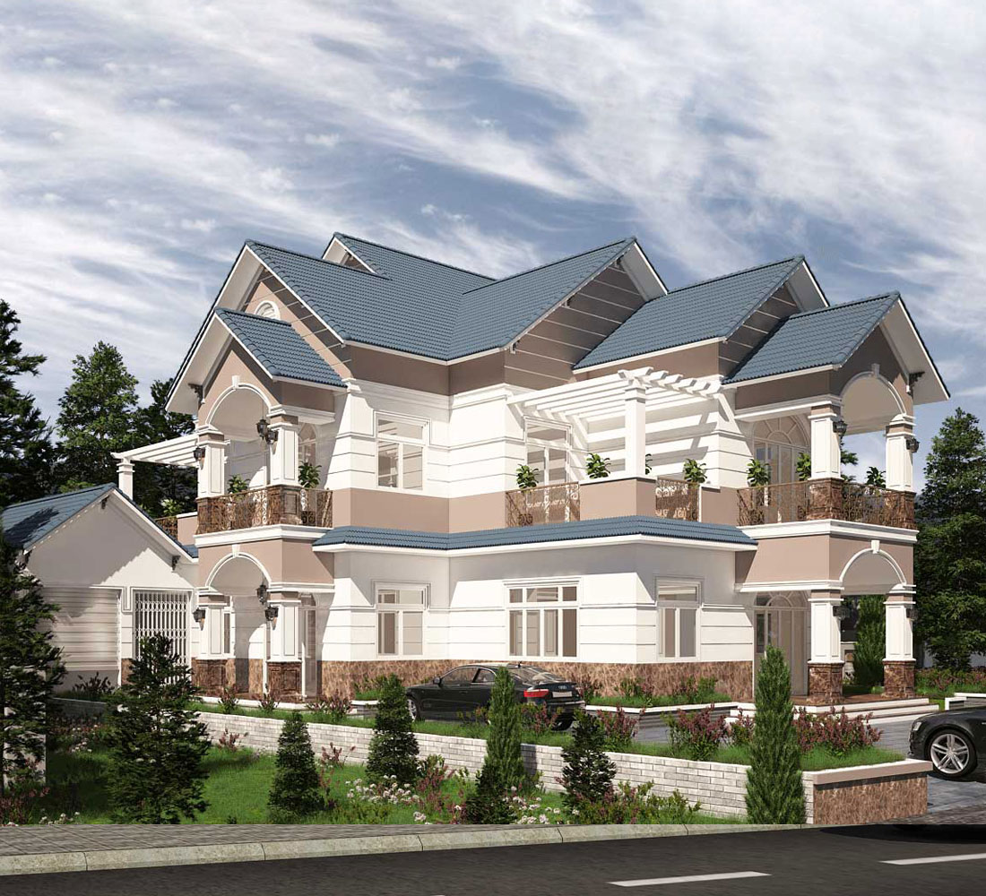 Mẫu thiết kế nhà villa 2 tầng mái Thái được xây dựng trên diện tích 350m2 kể cả phần sân. Thiết kế theo kiến trúc tân cổ điển châu Âu với mái Thái chữ A bằng ngói màu xanh vô cùng thanh thoát và đẹp mắt. Được kiến trúc sư bố trí theo đúng các nguyên tắc phong thủy nhằm mang đến mọi điều may mắn cho gia chủ về sức khỏe, tài lộc và trong công việc.