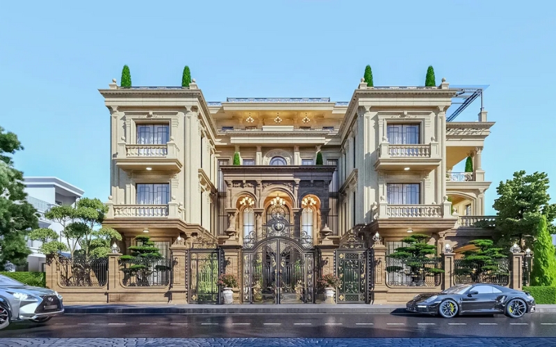 Mẫu thiết kế biệt thự 4 tầng mang đến không gian sống rộng rãi cho gia đình đông thành viên. Thiết kế này thường sử dụng hệ thống cột trụ lớn và mái vòm cao để tạo sự bề thế cho công trình. Không gian bên trong được bố trí thông minh với nhiều phòng ngủ và khu vực sinh hoạt chung, đáp ứng nhu cầu sống hiện đại của gia đình đông thành viên mà vẫn giữ được sự sang trọng cần có. Các chi tiết hoa văn được chăm chút kỹ lưỡng để tăng thêm sự xa hoa, lộng lẫy cho công trình.