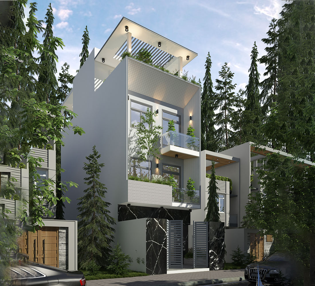Mẫu nhà phố 4 tầng với mặt tiền hiện đại thiết kế có cây cảnh xanh mát. Mẫu thiết kế được triển khai hoàn toàn cho anh kỹ sư cầu đường vui vẻ, mong muốn có cuộc sống gắn kết và gần giữa các thành viên và thiên nhiên. Thiết kế nhà phố 4 tầng, kiến trúc mái bằng để tạo nên sự độc đáo và có thể cân chỉnh hiệu ứng không gian chung. Ngoại thất sáng màu, đảm bảo khôn gian sống hiện đại. Thiết kế yêu cầu có không gian để xe ô tô, giếng trời, cây xanh.